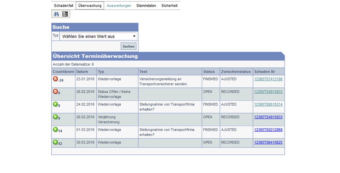 Durch das bewährte Ampelsystem versäumen Sie keine Fristen mehr. Der TQ-Claim³ Überwachungsassistent zeigt Ihnen nicht nur alle Melde- und Verjährungsfristen übersichtlich an, sondern auch die von Ihnen gesetzten Wiedervorlagetermine. Springen Sie direkt zum Schadensfall ohne Suchen.