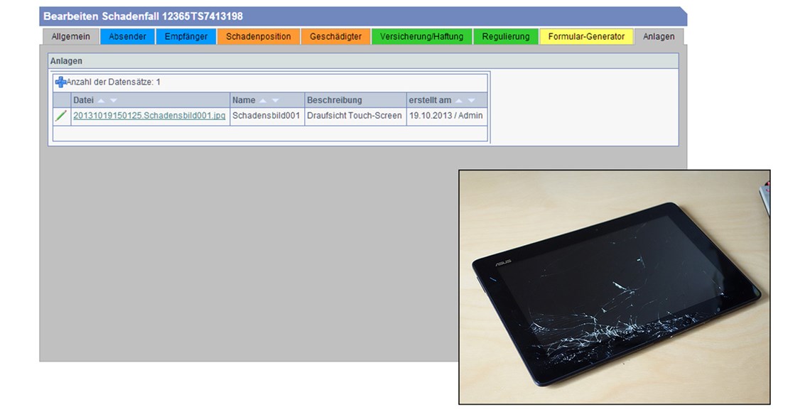 Kein Blättern und kein Suchen mehr durch direkte digitale Verfügbarkeit aller schadensrelevanten Dokumente. Sie können jedem Schadensfall Dateien und Dokumente anhängen.